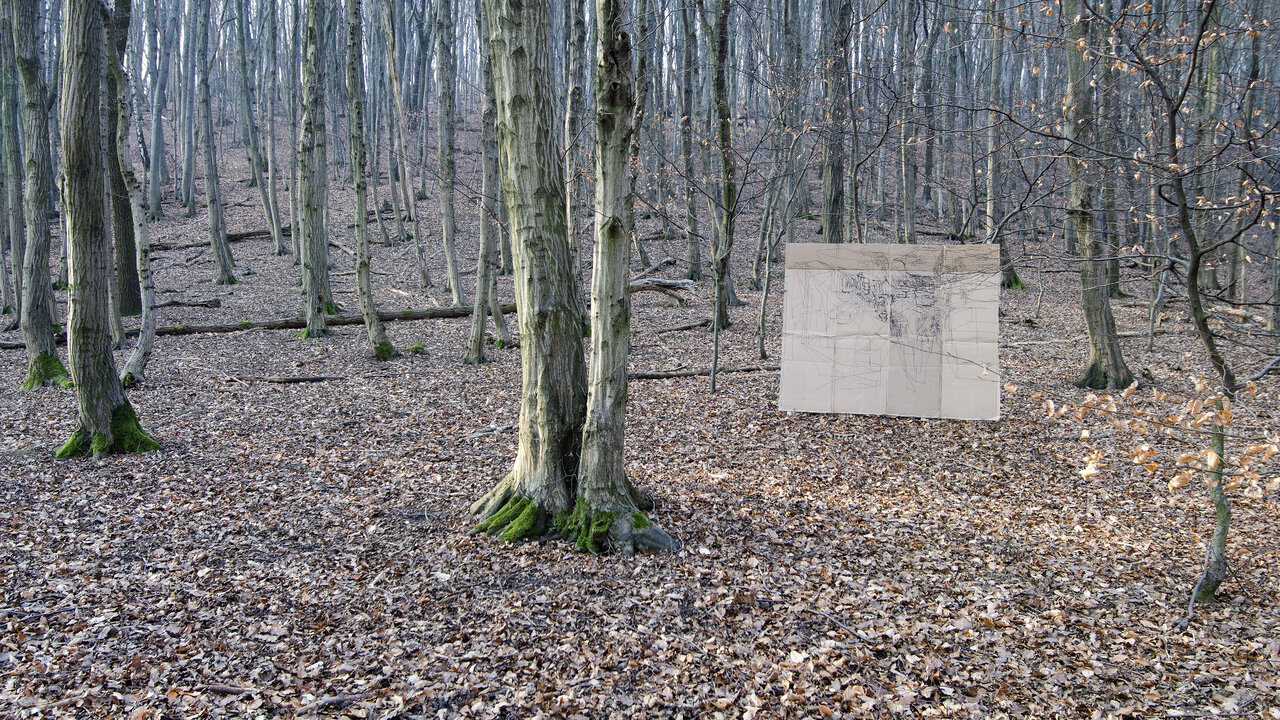 Ersatz, 2012, pierre noire sur carton déplié, 186 x 228 cm exhibited at WhiteProject