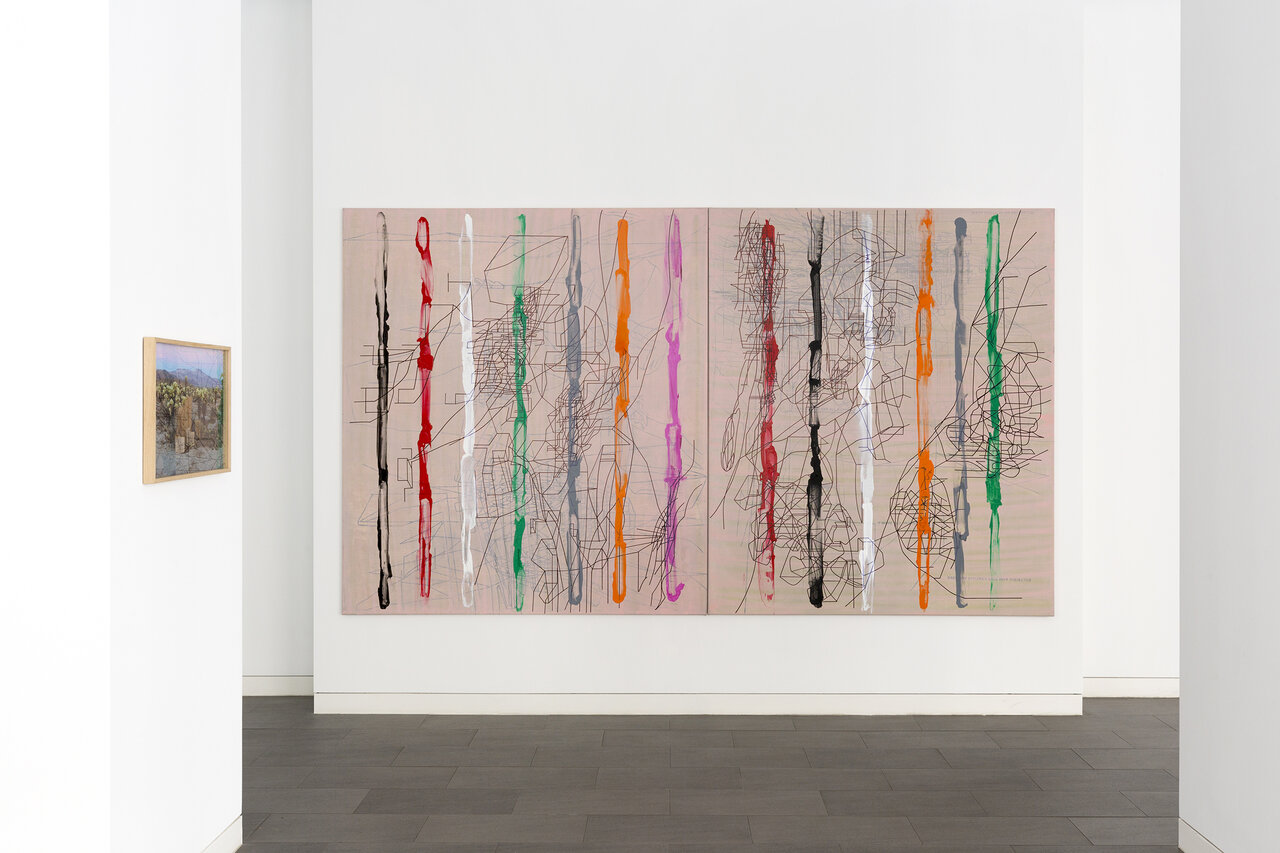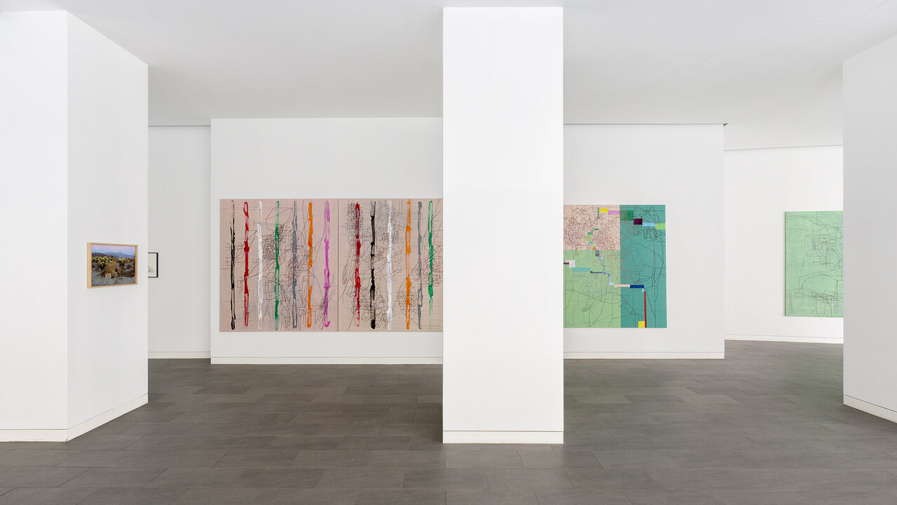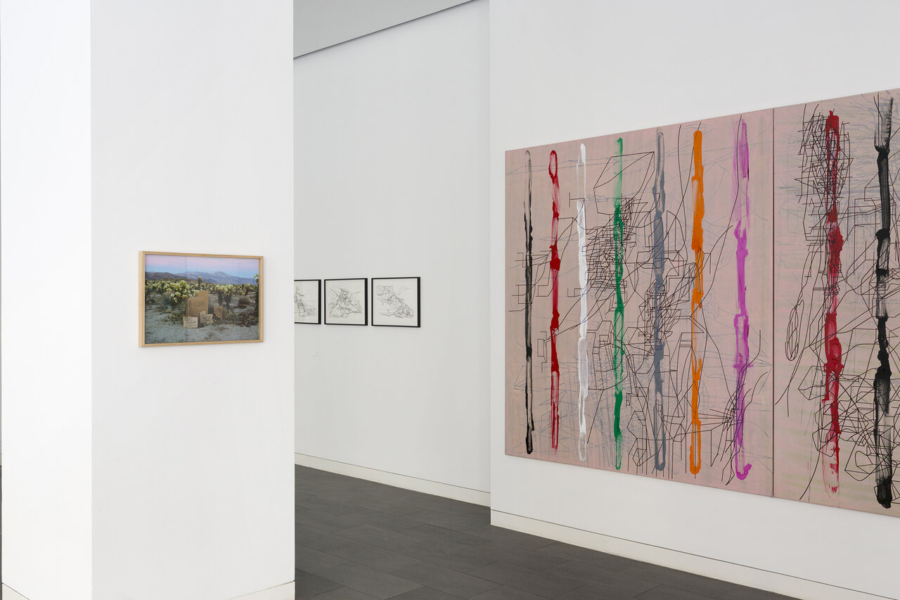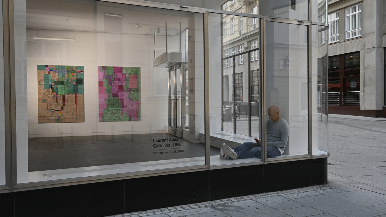 Seine künstlerische Praxis führt Ajina um die ganze Welt. Ob in Beirut, Dubai, Los Angeles oder dem Wiener Wald – Ajinas Werke reagieren auf ihr Umfeld und vermischen dabei aktuelle Eindrücke mit längst vergangenen Erinnerungen. Die Ausstellung „CaliforniaLINE" reflektiert Ajinas langjährige Verbindung zu Los Angeles, wo er seit den 1990er Jahren immer wieder lebt und arbeitet. In einer neuen, noch nie gezeigten Gemäldeserie reichert der Künstler seine schwarzen Linienzeichnungen durch farbige Markierungen an, die den verheißungsvollen Hedonismus der Stadt mit ihren gepflegten Gärten, blühenden Kakteen und in der Sonne glitzernden Pools widerspiegeln.