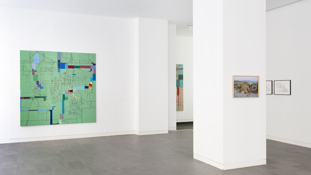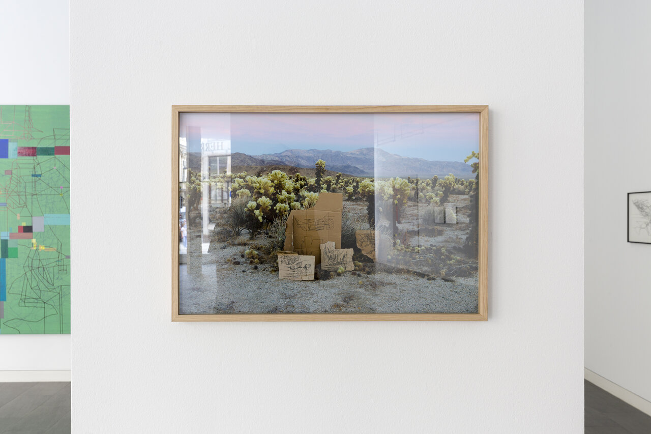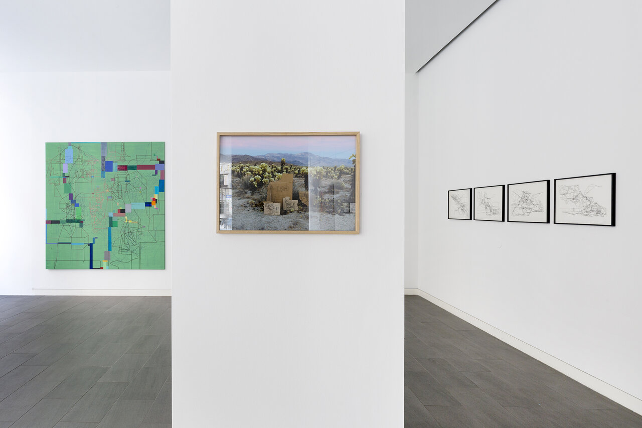 Seine künstlerische Praxis führt Ajina um die ganze Welt. Ob in Beirut, Dubai, Los Angeles oder dem Wiener Wald – Ajinas Werke reagieren auf ihr Umfeld und vermischen dabei aktuelle Eindrücke mit längst vergangenen Erinnerungen. Die Ausstellung „CaliforniaLINE" reflektiert Ajinas langjährige Verbindung zu Los Angeles, wo er seit den 1990er Jahren immer wieder lebt und arbeitet. In einer neuen, noch nie gezeigten Gemäldeserie reichert der Künstler seine schwarzen Linienzeichnungen durch farbige Markierungen an, die den verheißungsvollen Hedonismus der Stadt mit ihren gepflegten Gärten, blühenden Kakteen und in der Sonne glitzernden Pools widerspiegeln.