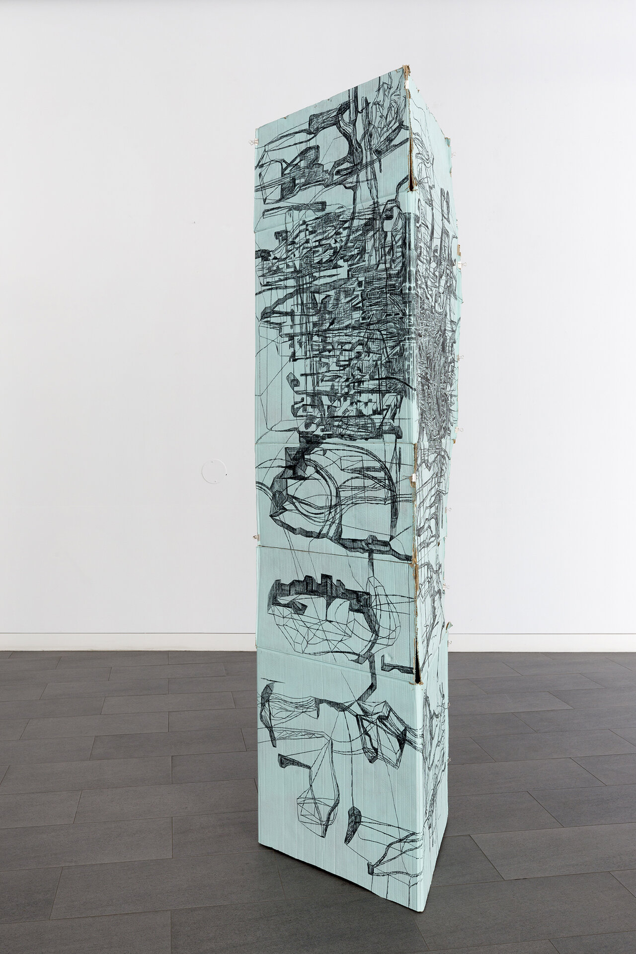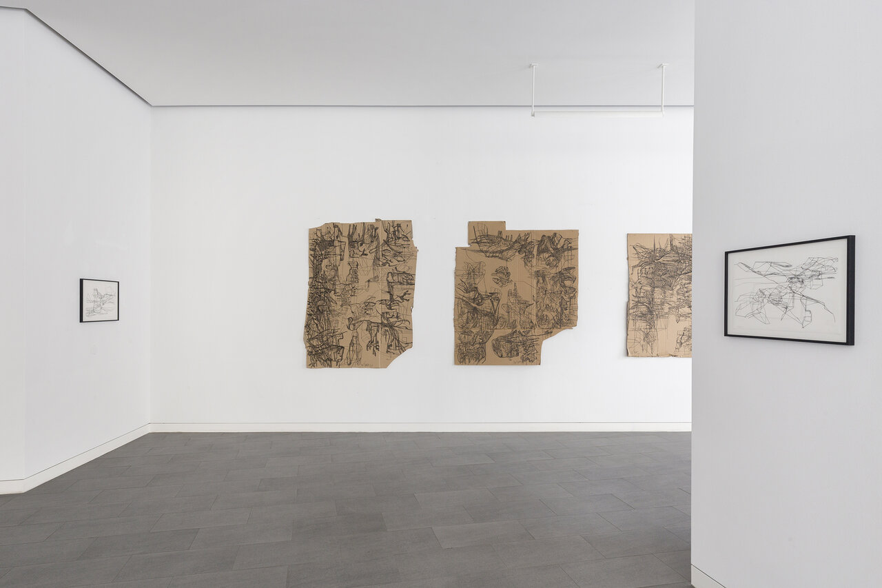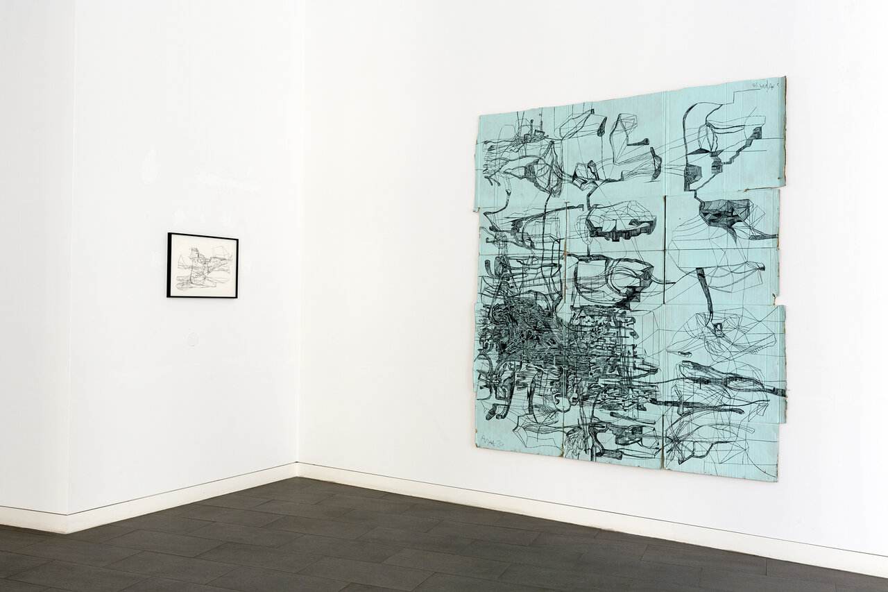 In starkem Kontrast zu diesen farbintensiven Arbeiten auf Leinwand stehen die Zeichnungen auf Pappkartons, die der Künstler auf dem Boden liegend präsentiert oder zu dreidimensionalen Strukturen faltet. Die Linienformationen werden so zu transportablen Skulpturen, die Ajina auf seinen Reisen begleiten. In den engen Gassen Venedigs oder auf den steinigen Hügeln Griechenlands interagieren sie mit ihrer Umgebung, werden Teil der Landschaft oder bleiben fremdartige Besucher. Fotografiert und filmisch festgehalten können diese Interventionen weitertransportiert und an anderen Orten gezeigt werden. So schafft Ajina ein weltweites Netzwerk visueller Referenzen, das unendlich fortgesetzt werden kann.