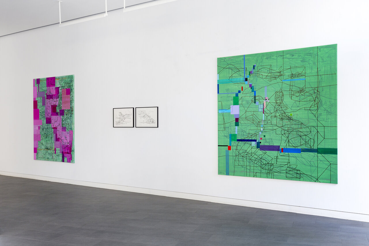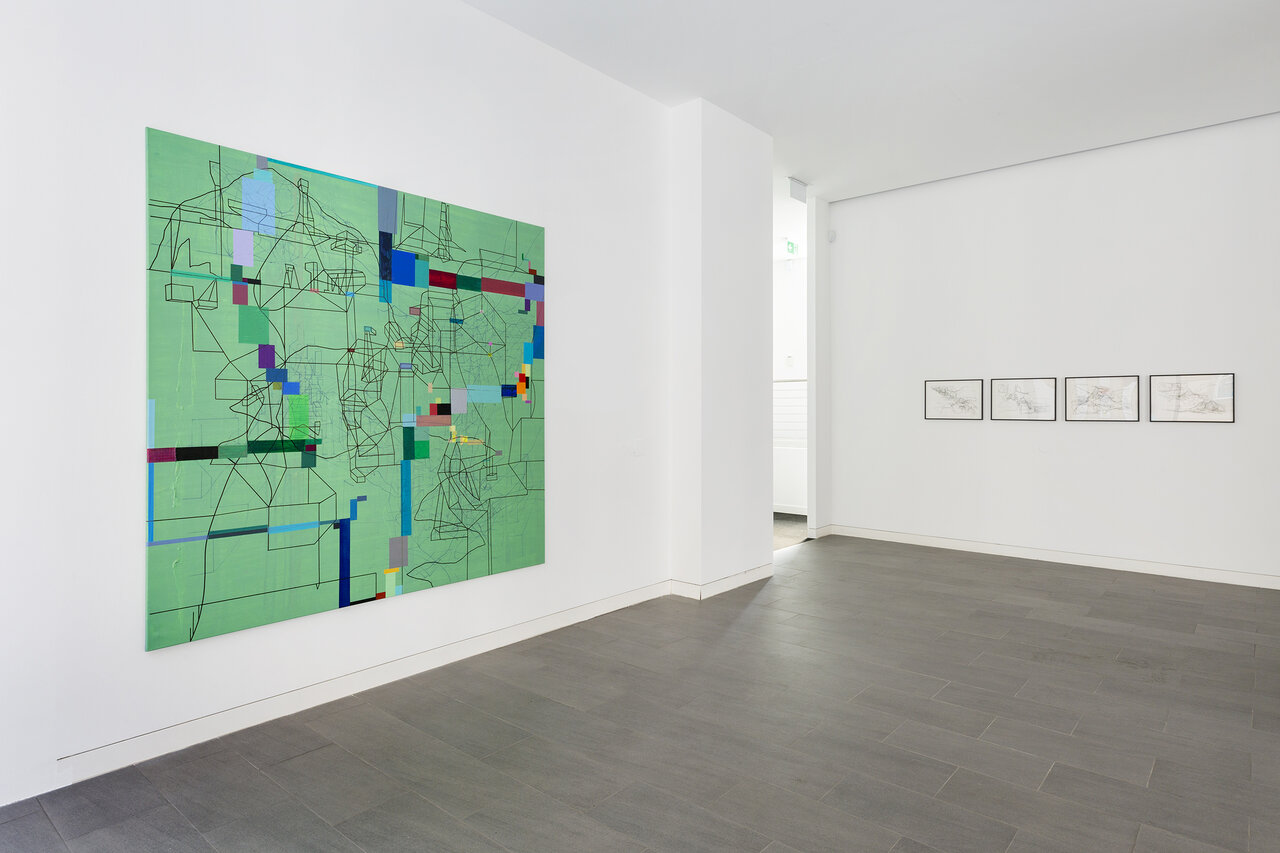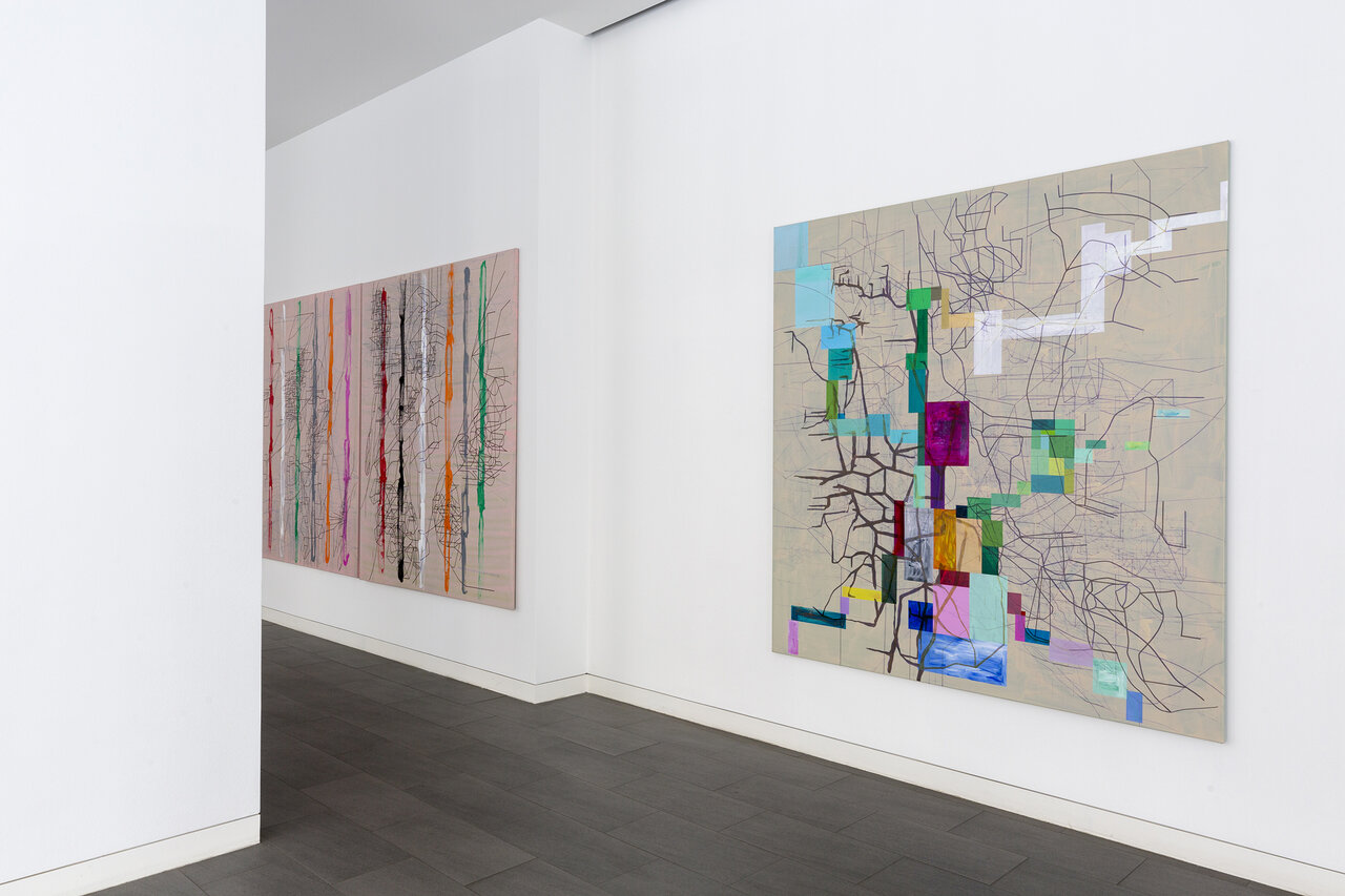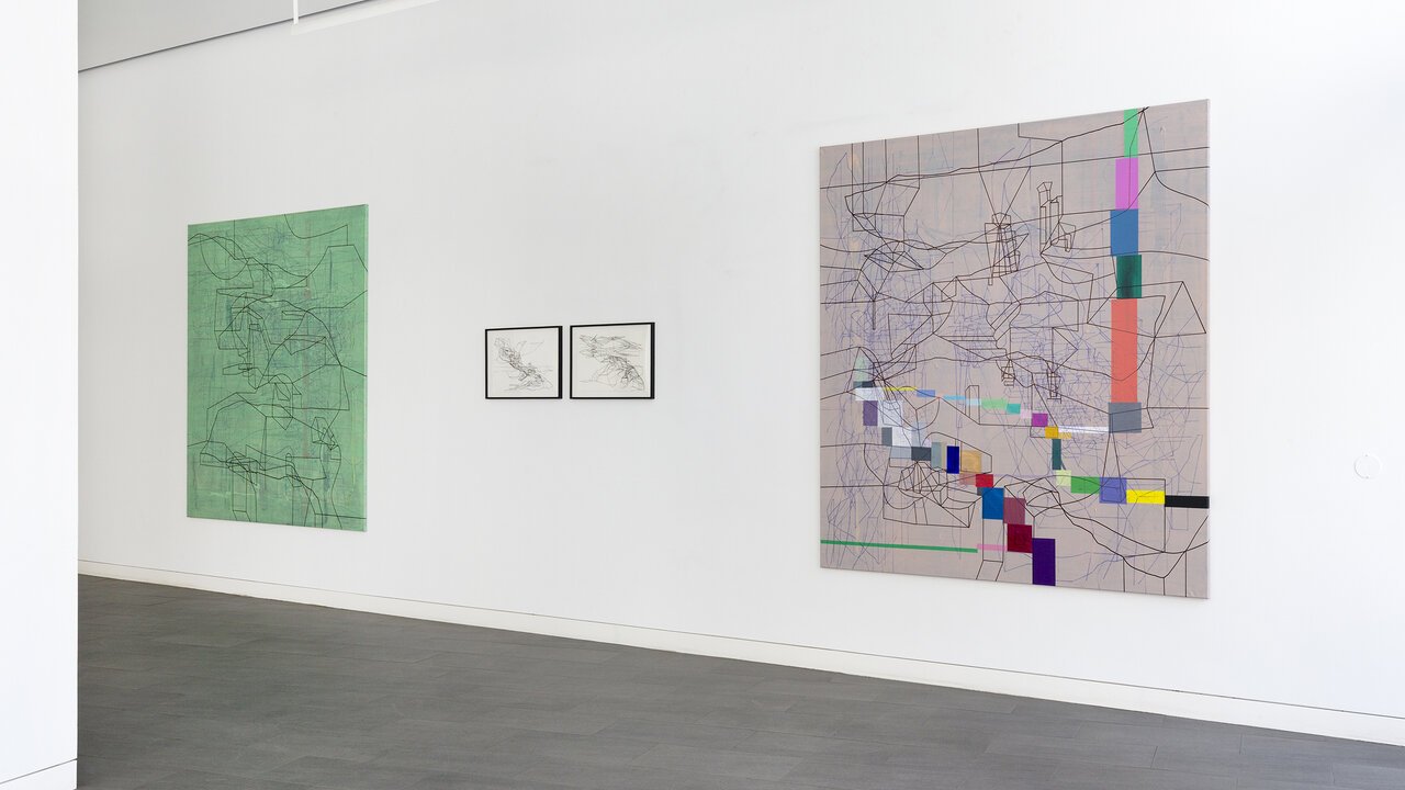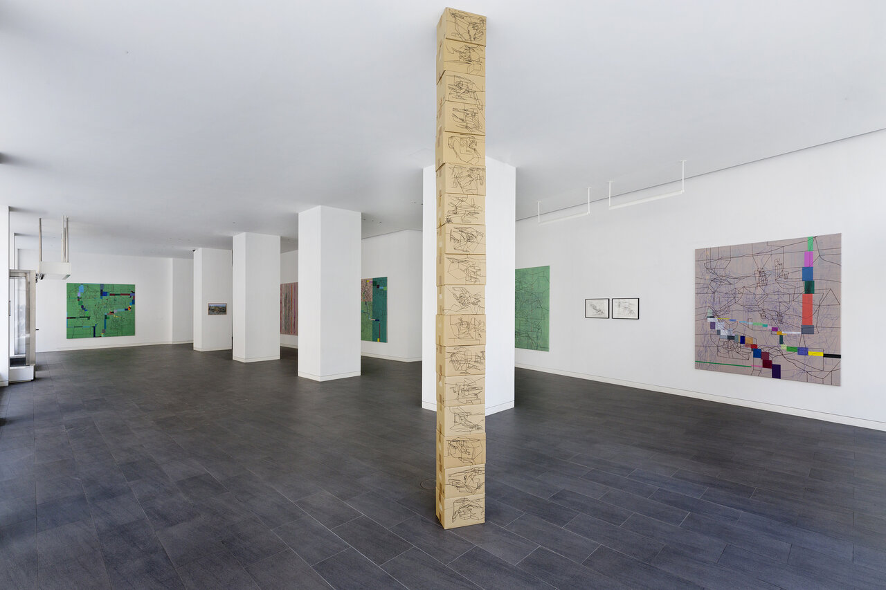 We kindly invite you to the opening of the exhibition California_LINE in our new temporary exhibition space CRONE SIDE VIENNA at Hochhaus Herrengasse. The show will feature works by the French-Iraqi artist Laurent Ajina, whose line drawings travel around the world and interact with places, their landscapes and histories. Ajina's drawings are imbued with an architectural spirit. They are precise, clearly structured and seem to arise from an internal order, growing incessantly. The primary element of his drawings isalways the line. Drawn with a black marker, it spreads out over canvases, cardboard boxes or even walls and ceilings, forming abstract structures that evoke a variety of associations both expanding and condensing the view of the visitor. His artistic practice takes Ajina around the world. Whether in Beirut, Dubai, Los Angeles, or the Wiener Wald, Ajina's works react to their surroundings, mixing current impressions with long gone memories. The exhibition California_LINE reflects Ajina's long-standing connection to Los Angeles, where he has lived and worked repeatedly since the 1990s. In a new series of paintings that has never been shown before, the artist enriches his black line drawings with colored areas that reflect the city's promising hedonism with its well-kept gardens, flowering cacti, and pools glistening in the sun. The color-intensive works on canvas strongly contrast the drawings on cardboard boxes, which are either presented lying on the floor or folded into three-dimensional structures. The linear drawings thus become portable sculptures that accompany Ajina on his travels. In the narrow streets of Venice or on the rocky hills of Greece – the folded cardboards interact with their surroundings, become part of the landscape or remain foreign visitors. Photographed or caught on film, these interventions can again be transported and presented at other locations. Thus, Ajina creates a worldwide network of visual references that can be constantly expanded. Born in 1970 in Paris, Ajina first studied at the University of Architecture Paris la Seine before dedicating himself entirely to the visual arts. Ajina's works have been shown in numerous international solo exhibitions, for instance in Paris, Berlin and New York. Since 2006, he has created over forty monumental wall drawings that cover both public and private spaces. He lives and works between Vienna, Paris and Los Angeles.