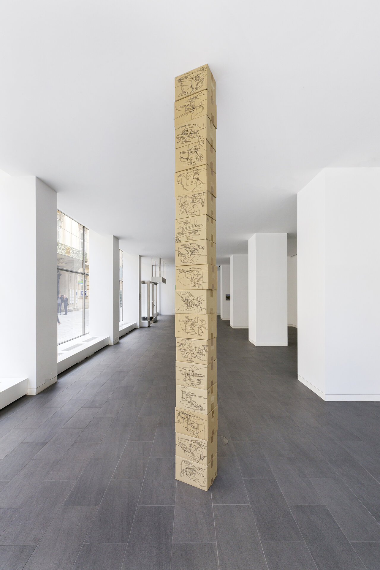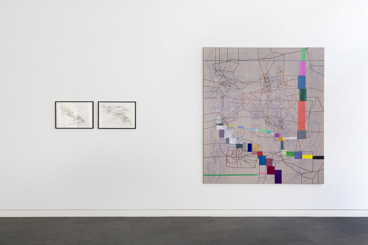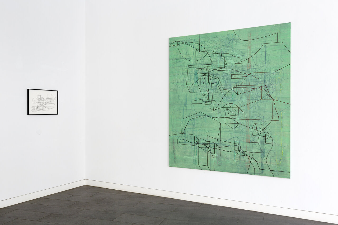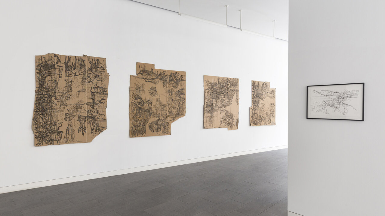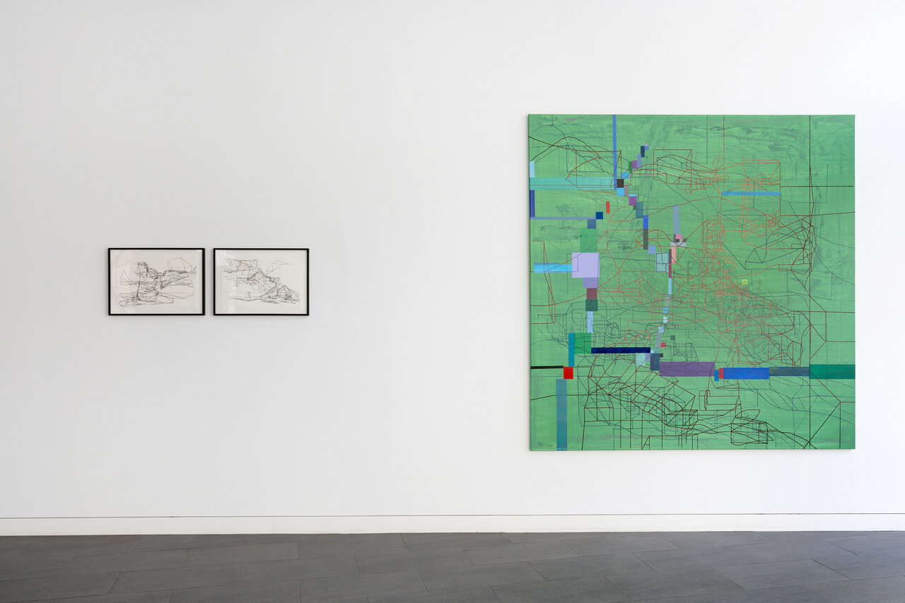We kindly invite you to the opening of the exhibition California_LINE in our new temporary exhibition space CRONE SIDE VIENNA at Hochhaus Herrengasse. The show will feature works by the French-Iraqi artist Laurent Ajina, whose line drawings travel around the world and interact with places, their landscapes and histories. Ajina's drawings are imbued with an architectural spirit. They are precise, clearly structured and seem to arise from an internal order, growing incessantly. The primary element of his drawings isalways the line. Drawn with a black marker, it spreads out over canvases, cardboard boxes or even walls and ceilings, forming abstract structures that evoke a variety of associations both expanding and condensing the view of the visitor. His artistic practice takes Ajina around the world. Whether in Beirut, Dubai, Los Angeles, or the Wiener Wald, Ajina's works react to their surroundings, mixing current impressions with long gone memories. The exhibition California_LINE reflects Ajina's long-standing connection to Los Angeles, where he has lived and worked repeatedly since the 1990s. In a new series of paintings that has never been shown before, the artist enriches his black line drawings with colored areas that reflect the city's promising hedonism with its well-kept gardens, flowering cacti, and pools glistening in the sun. The color-intensive works on canvas strongly contrast the drawings on cardboard boxes, which are either presented lying on the floor or folded into three-dimensional structures. The linear drawings thus become portable sculptures that accompany Ajina on his travels. In the narrow streets of Venice or on the rocky hills of Greece – the folded cardboards interact with their surroundings, become part of the landscape or remain foreign visitors. Photographed or caught on film, these interventions can again be transported and presented at other locations. Thus, Ajina creates a worldwide network of visual references that can be constantly expanded. Born in 1970 in Paris, Ajina first studied at the University of Architecture Paris la Seine before dedicating himself entirely to the visual arts. Ajina's works have been shown in numerous international solo exhibitions, for instance in Paris, Berlin and New York. Since 2006, he has created over forty monumental wall drawings that cover both public and private spaces. He lives and works between Vienna, Paris and Los Angeles.