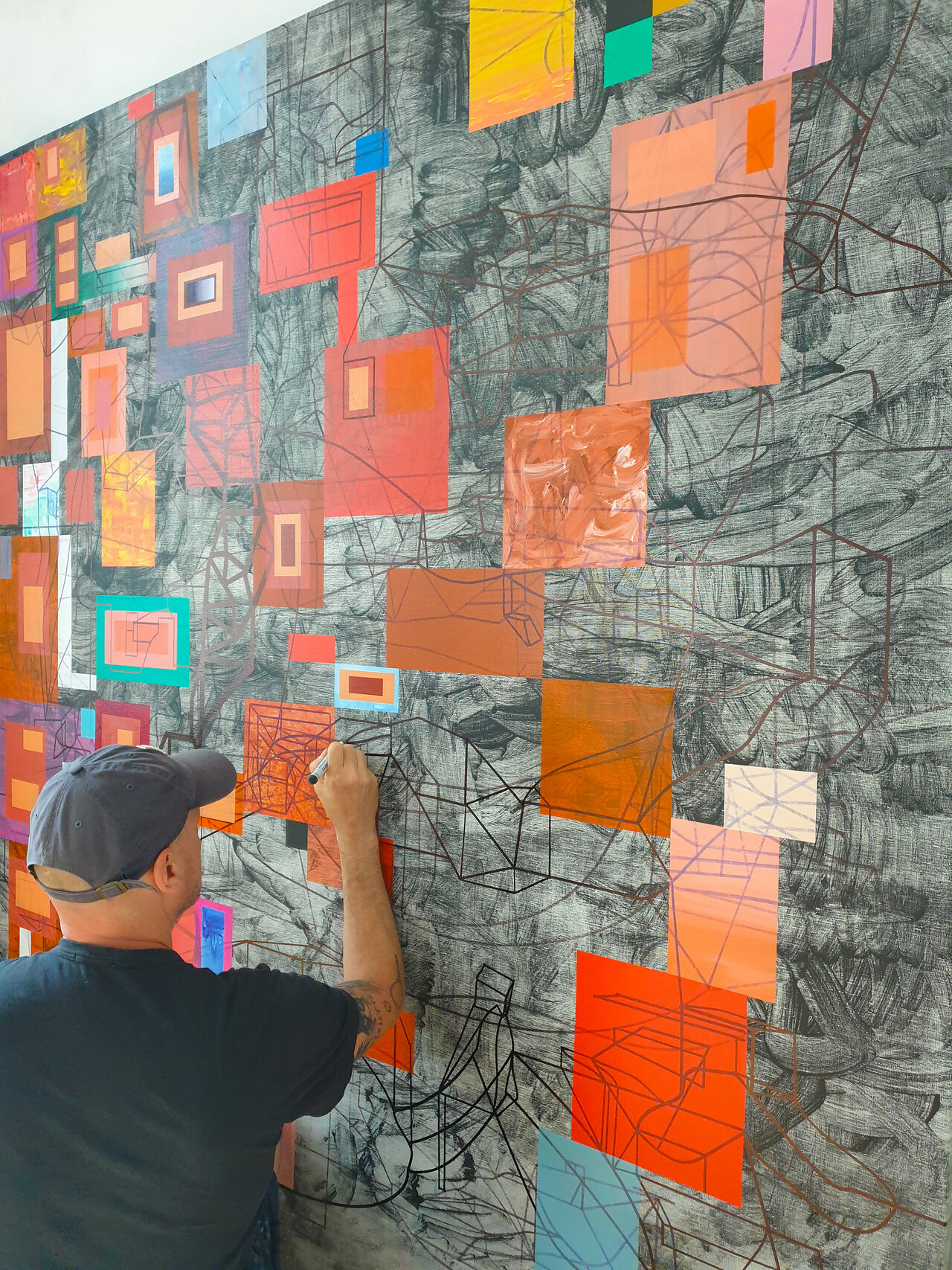 Educated initially as an architect, the built structure of the city is also at the center of his artistic work, which is situated at the interface between painting and drawing. However, he is less interested in real urban landscapes than in the rhythm of a city - the movement of people, the networks of lines, floor markings, street signs that public and individual transport imprints on the city and the colorful network they form.