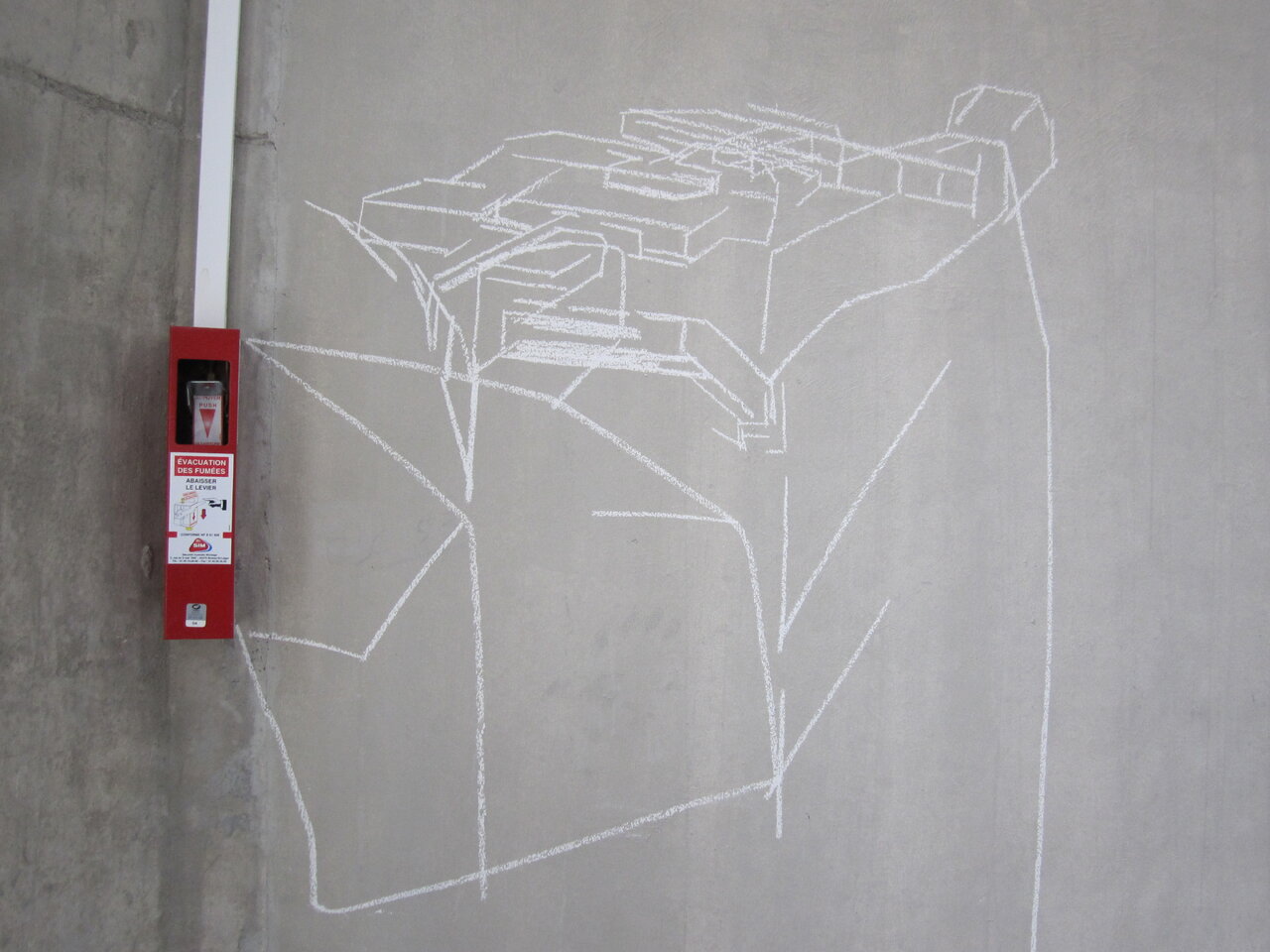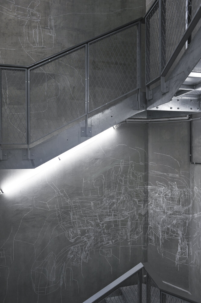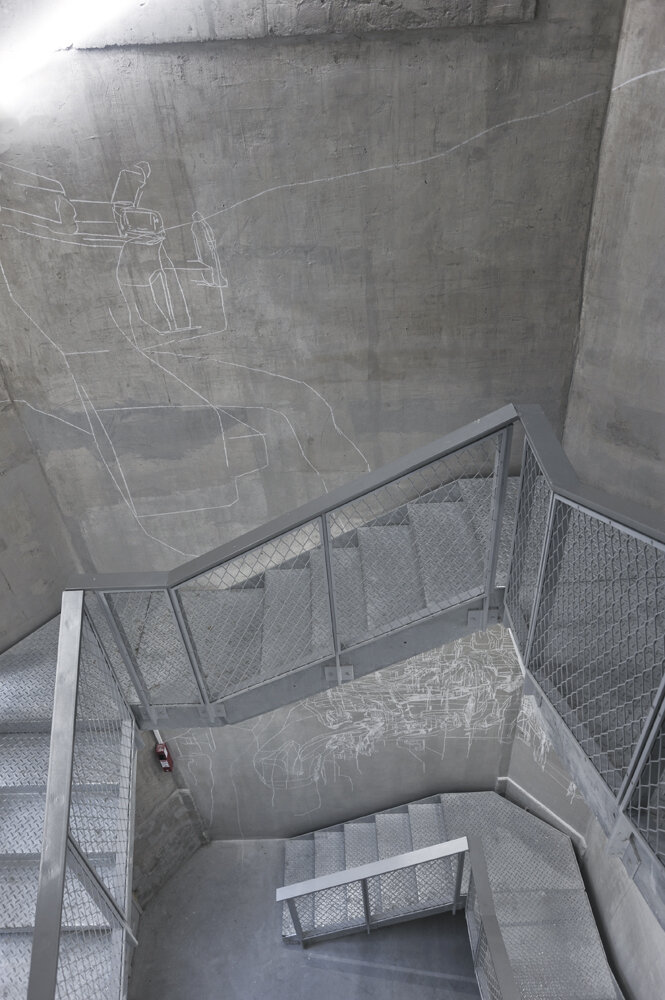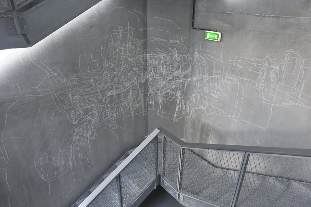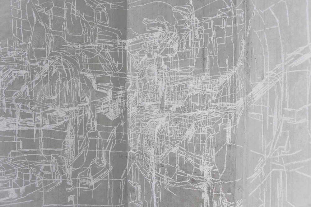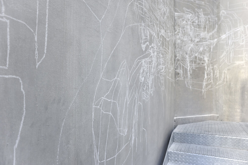 au CentQuatre, Artist residency at "le château d'eau", white chalk on wall, variable size, Paris, Photo: Rebecca Fanuele
