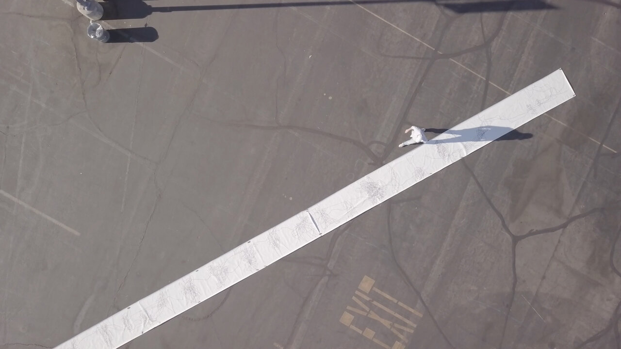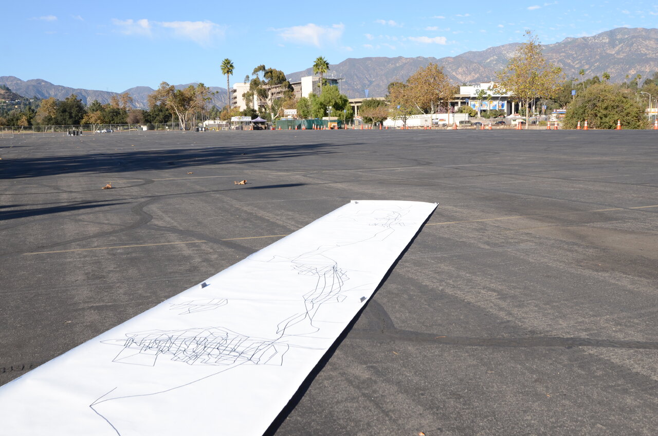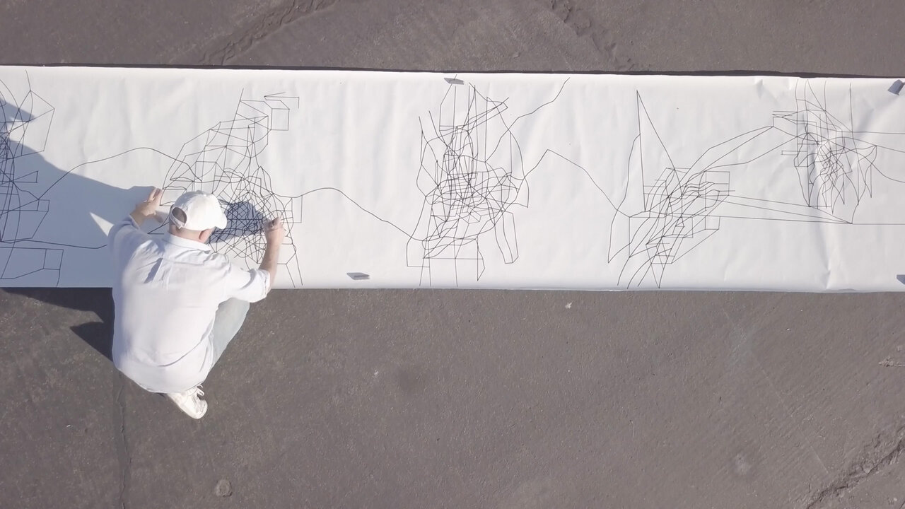 What the drone captures in high definition as it hovers over a rooftop in downtown L.A. and over the Rose Bowl parking lot in Pasadena is the action of the artist as he recreates his Californian dream; the free expression in black marker of the mental cartography of his trajectory in Los Angeles today.