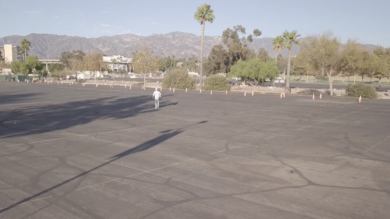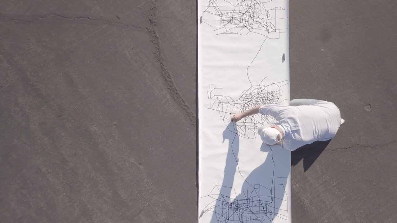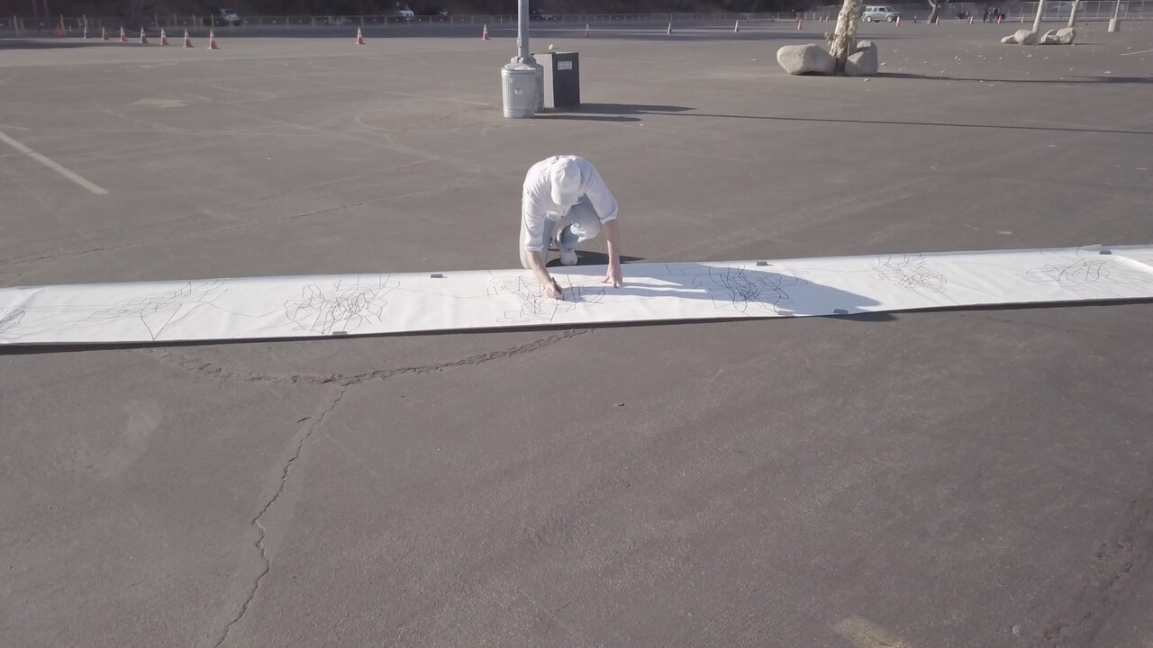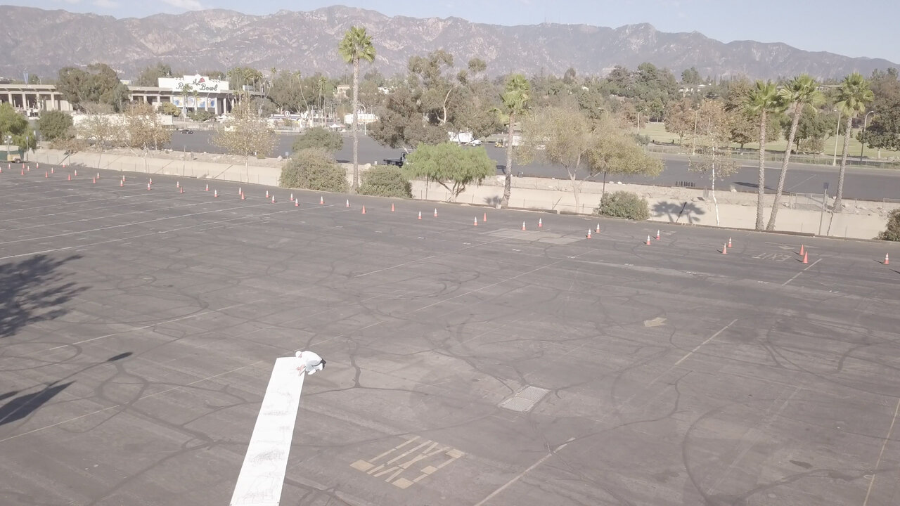 What the drone captures in high definition as it hovers over a rooftop in downtown L.A. and over the Rose Bowl parking lot in Pasadena is the action of the artist as he recreates his Californian dream; the free expression in black marker of the mental cartography of his trajectory in Los Angeles today.