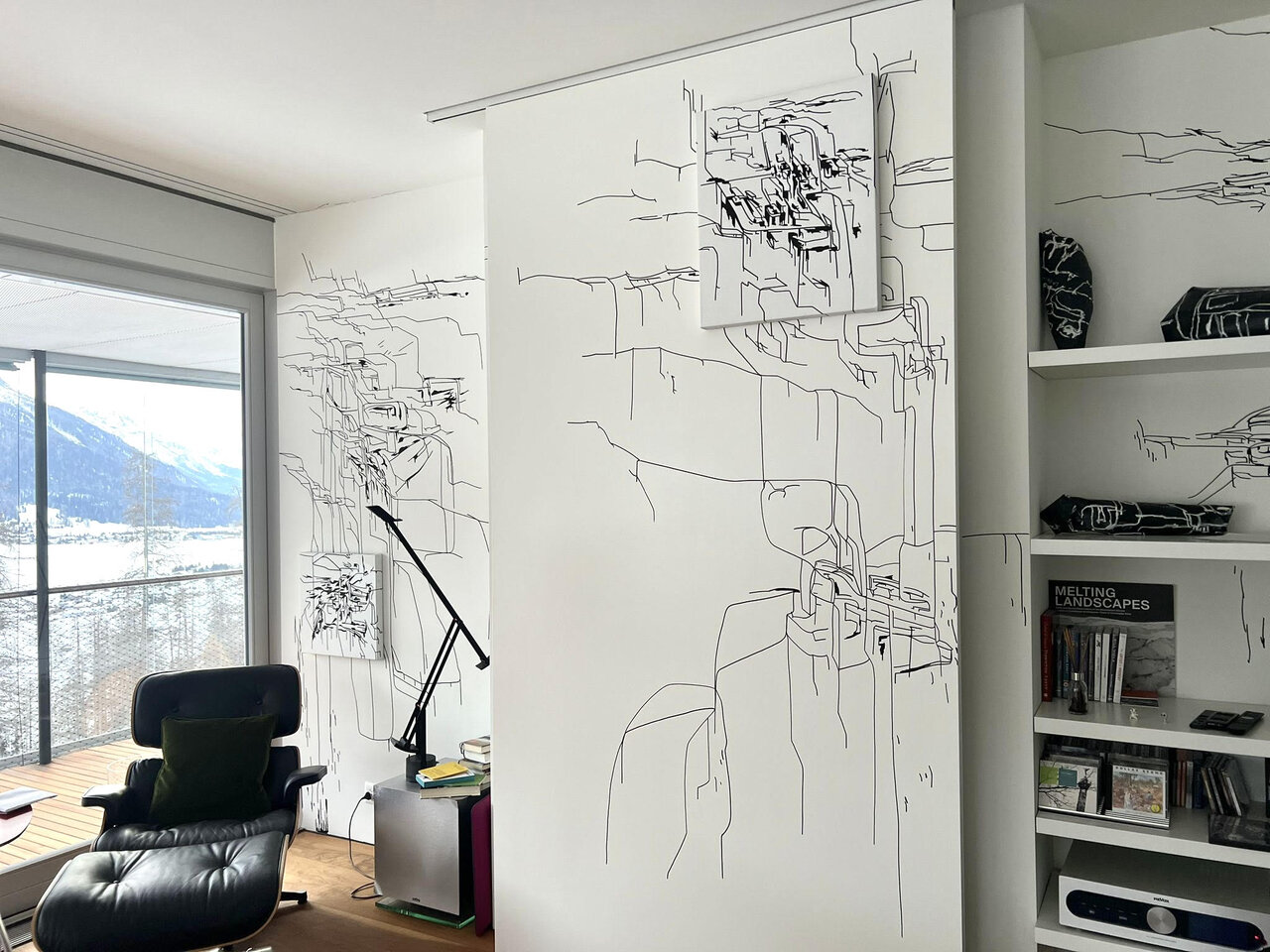 Paintmarker on wall connected to paintings and modules sculptures, Zuoz