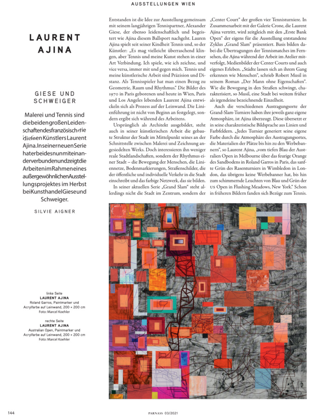 In his current series, “Grand Slam,” however, the focus is not on the city, but on the “center court” of the big four tennis tournaments. In cooperation with Galerie Crone, which represents Laurent Ajina, the cycle “Grand Slam”, created especially for the exhibition, is presented at the same time as the “Erste Bank Open”. It is based on the broadcasts of the tennis matches on television, which Ajina follows while working in the studio, media images of the center courts and also his own experience. "Cities can be recognized by their walk, like people," wrote Robert Musil in his novel “The Man Without Qualities.” How movement resonates in the streets, Musil argued, characterizes a city far earlier than any telling detail.