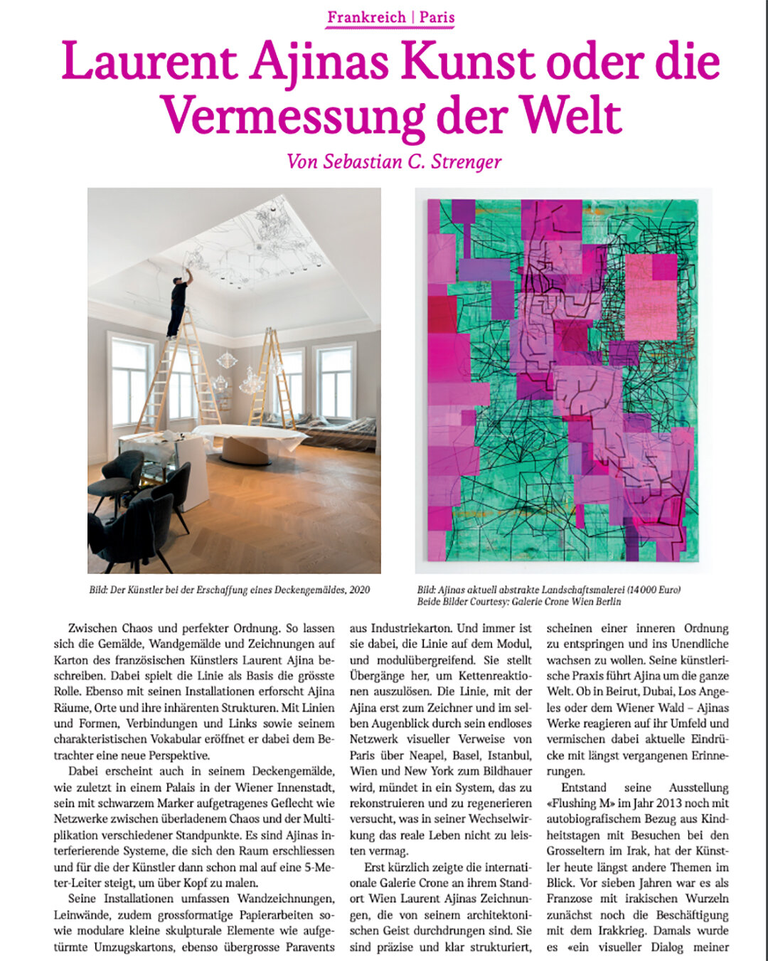 Erst kürzlich zeigte die internationale Galerie Crone an ihrem Standort Wien Laurent Ajinas Zeichnungen, die von seinem architektonischen Geist durchdrungen sind. Sie sind präzise und klar strukturiert, scheinen einer inneren Ordnung zu entspringen und ins Unendliche wachsen zu wollen. Seine künstlerische Praxis führt Ajina um die ganze Welt. Ob in Beirut, Dubai, Los Angeles oder dem Wiener Wald – Ajinas Werke reagieren auf ihr Umfeld und vermischen dabei aktuelle Eindrücke mit längst vergangenen Erinnerungen.